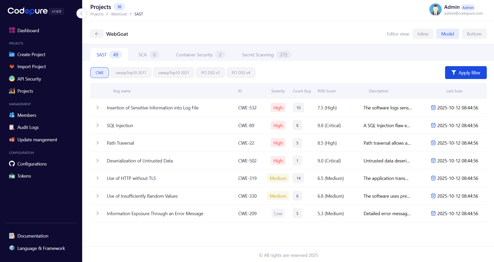 Codepure’s SAST engine performs comprehensive security analysis of your application’s source code during the development phase. By examining code structure, data flows, and control flows, SAST identifies security vulnerabilities, quality issues, and compliance violations before they reach production.Core Capabilities