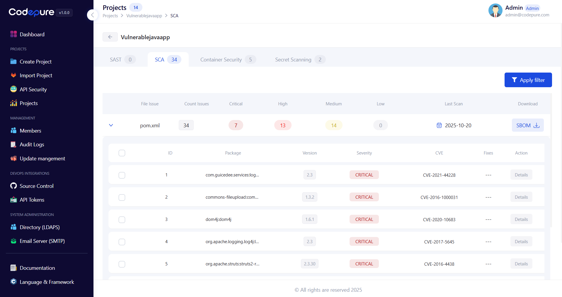 Software Composition Analysis (SCA) is a critical security practice that automatically identifies and manages open-source components and third-party dependencies in your codebase. Codepure’s SCA solution provides comprehensive visibility into your software supply chain, helping you identify vulnerabilities, license risks, and outdated components before they become security incidents.What is SCA?