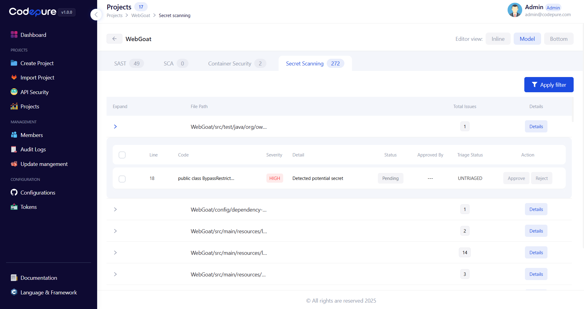 Codepure employs sophisticated regex patterns and rule sets to identify secrets:- High-Entropy String Analysis: Detects random-looking strings likely to be secrets