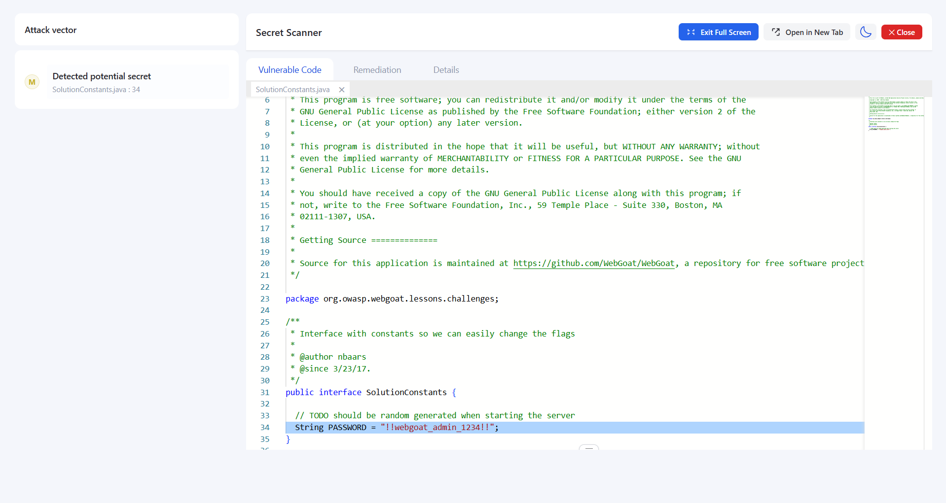Click Open on any finding to view:- Secret Details: Type, format, and entropy score